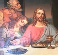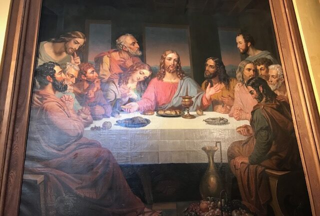 Jag stod länge och betraktade denna målning eftersom jag blev intresserad av hur lärjungarna gestaltades av denna konstnär. Kring bordet sitter 12 lärjungar kring Jesus, som sitter i mitten. Det intressanta är att 11 av lärjungarna är ”riktiga män” med helskägg. Den lärjunge som sitter på Jesu högra sida (till vänster ur betraktarens ögon) har en helt annan framtoning. Enligt mina ögon är detta en kvinna. Hon ser mild ut, hennes händer och framtoning är kvinnliga och hon har inget skägg. Hon lutar sig ömt mot sin mästare och det ser ut som hon gör sig redo att ta emot maten som Jesus bjuder.